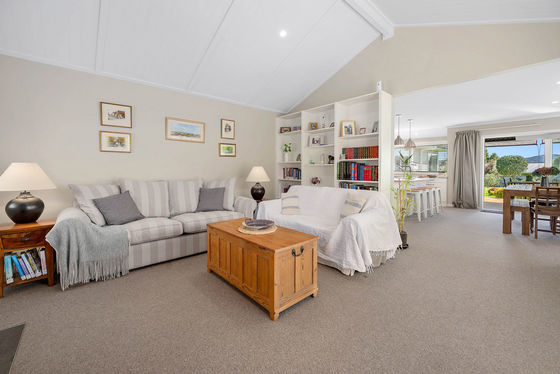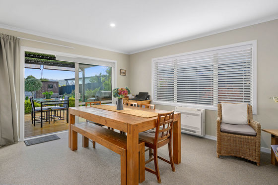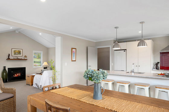 For more intimate gatherings, retreat to the separate formal lounge. Featuring a Metro log fire, elegant raked tongue-and-groove ceilings, and stunning wooden shutters that open to a private deck, it's a space that radiates warmth and character.