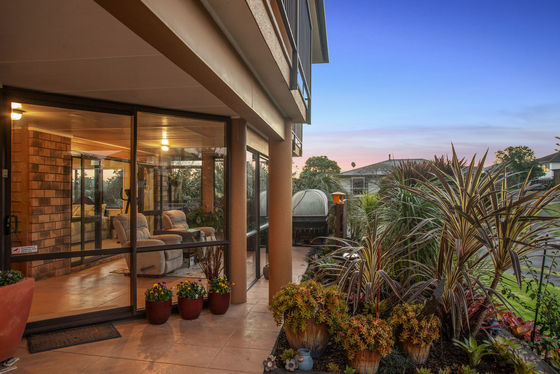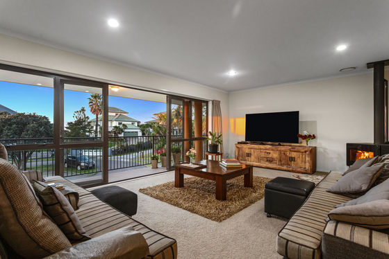 Sun-drenched living - North-facing open-plan areas flow seamlessly onto a spacious balcony, capturing sweeping views over Coastlands, the surrounding hills, and even White Island