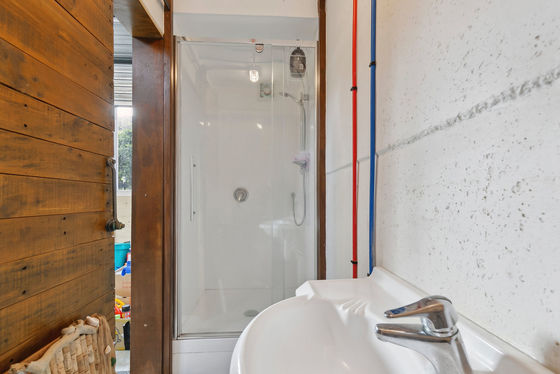 Comes with a full bathroom, shower, vanity and WCC with Renai heated water using central gas. Mezzanine shelves give lots of storage and space. Workbench with a hand basin that can be used as a kitchenette.