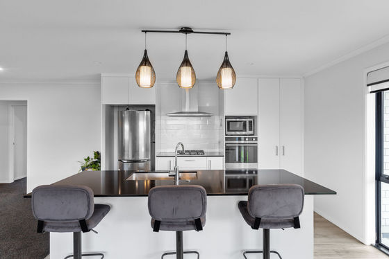 The modern kitchen features premium engineered stone benchtops, stainless steel Fisher & Paykel appliances, a 4-burner gas cooktop, and sleek finishes-perfect for entertainers and home chefs alike.