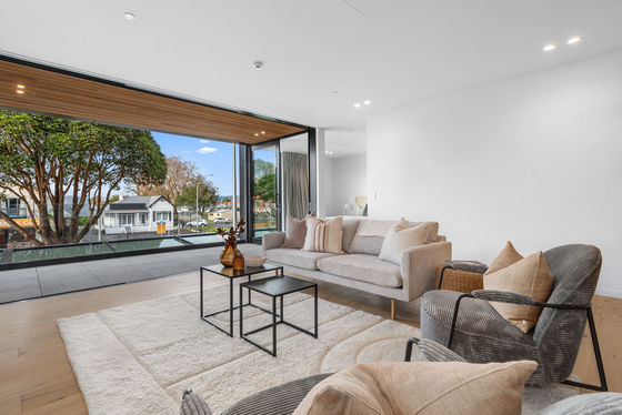 Located on the first floor, this stylish apartment showcases high stud ceilings, floor-to-ceiling double glazing, and a thoughtful open-plan layout designed for easy, modern living. At the heart of the home is a sleek contemporary kitchen, flowing effortlessly into a generous living space and out through stacker sliders to a wide tiled deck"perfect for watching the world go by.