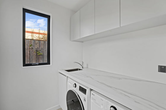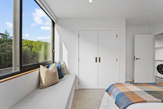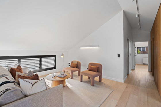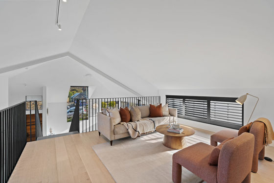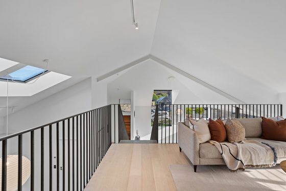 At the heart of the home, an elevated window creates a focal point in the main living space, offering a framed outlook to the front garden and skyline. The ground floor is anchored by open-plan living and dining, paired with a commercial-grade kitchen, a space crafted with entertaining and ease in mind. It's a home that favours connection over complication, tasteful simplicity over excess.