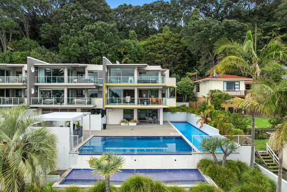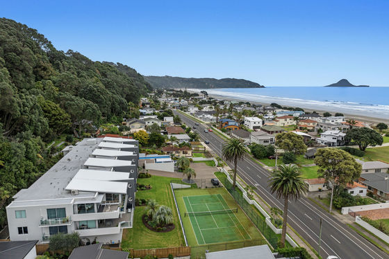 This spacious 138sqm apartment features three bedrooms and is designed to maximize light and views, with lush bushland on one side and stunning ocean vistas on the other. Its unique layout offers both generous space and privacy. Four sliding "hush glass" doors open onto a magnificent 36 m² covered outdoor deck, providing a perfect setting for entertaining family and friends while offering shelter from the summer sun. Imagine enjoying an afternoon sundowner on the deck, swimming in the recreational infinity pool, doing laps in the lap pool, working out in the gym, playing tennis on the turf court, unwinding in the sauna, or simply strolling along or swimming at Ohope Beach, renowned as New Zealand's most loved beach.