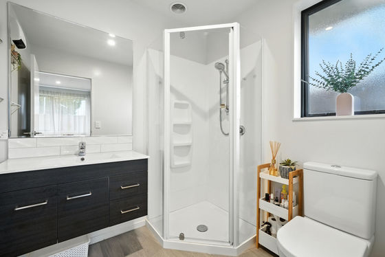 The main family bathroom is light, bright and functional, with a shub, vanity, toilet, heated towel rail & bathroom heater.