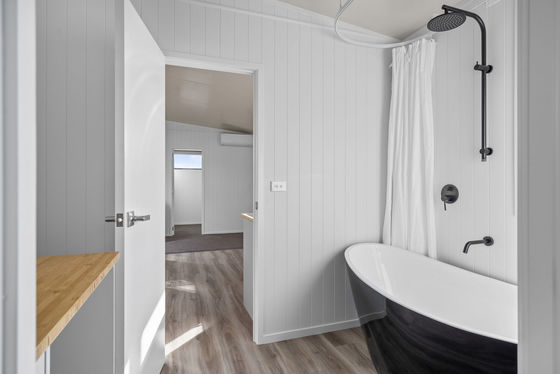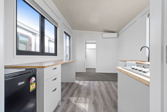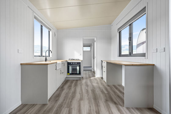A 12x3m platform, single storey house on wheels with two bedrooms, full kitchen including bamboo benchtop, gas hob/oven, butlers sink, tapware and black bar style fridge.
