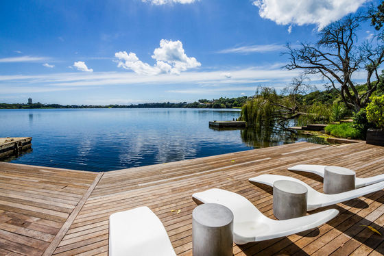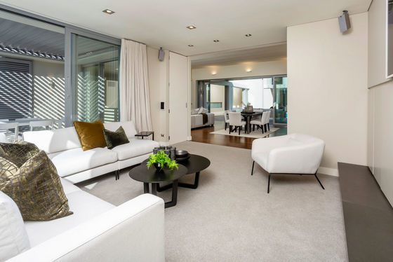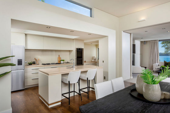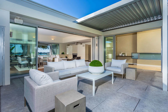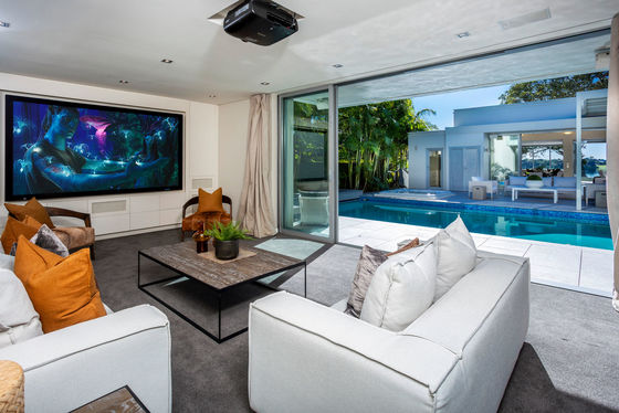 Offering five spacious double bedrooms and three sprawling living areas, the main living area features an open-plan layout with American oak flooring, timeless modern interiors, and seamless flow to a covered louvered deck offering panoramic lake views on one side. To the other, the space connects to the poolside courtyard, ensuring optimal indoor-outdoor flow. There is also a dedicated media room featuring a 120" screen, projector, surround sound, and wet bar.