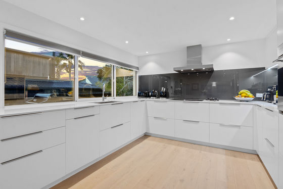 Offering a laid-back Californian beach house vibe, the home is filled with natural light and striking architectural angles. Travertine tiled floors with underfloor heating create a warm and luxurious atmosphere throughout. At the centre of the home, a spacious open-plan kitchen, dining, and living area with light timber flooring, anchored by a sleek, European-designed kitchen complete with high-end appliances, ideal for both entertaining and everyday living.