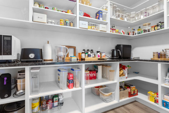 -Large stylish kitchen with marble bench tops and a large walk-in-pantry