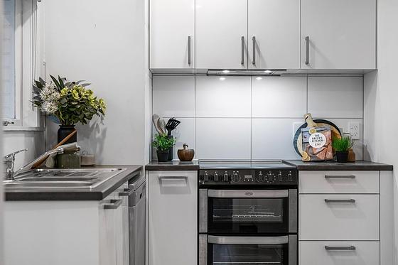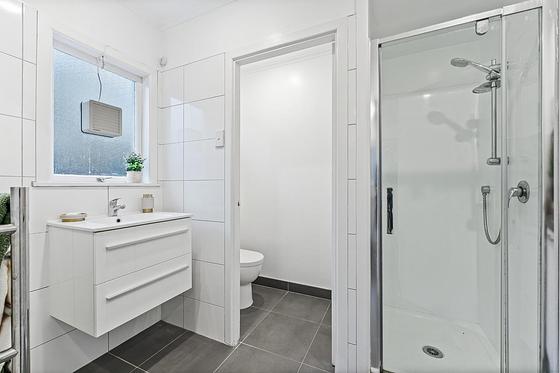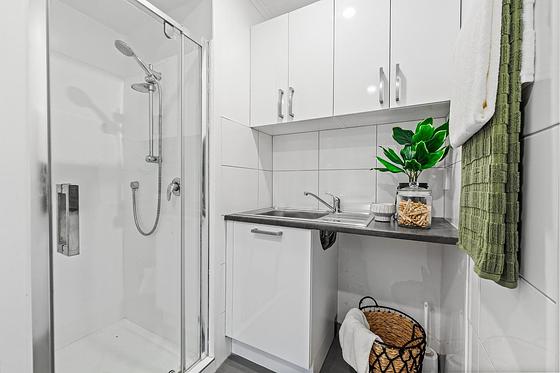 The layout is clever and super functional. You've got two separate entry doors (yes, two) opening to the kitchen and lounge. Perfect for flow, friends, or popping out mid prep to snip some fresh herbs. The retro glass doors? They're not just doors, they're a vibe. The living area is filled with natural light, the kitchen's practical with a nostalgic twist, and the bathroom setup is quirky and smart, with a separate loo and tucked away laundry.