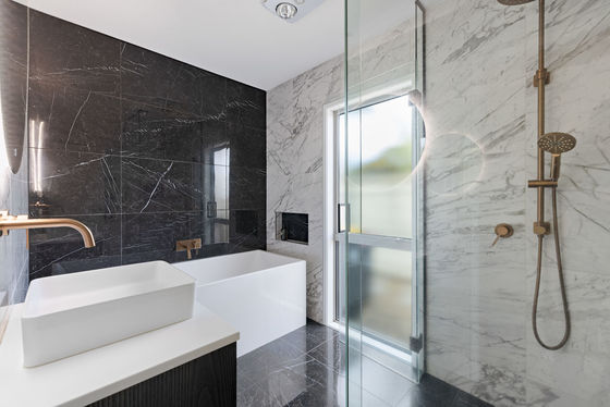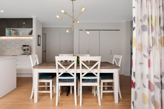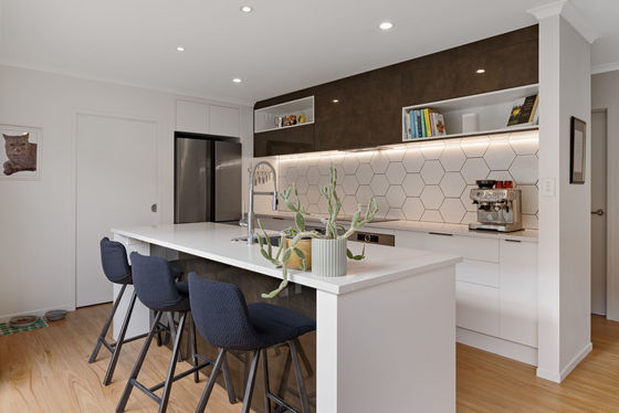 The 146 sqm (approx.) thoughtfully configured home showcases some eye-catching wall treatments and dazzling lighting. A media lounge boasts ringside orientation for views and light while the adjoining open plan dining/kitchen area has a handy study nook, wall mounted heat pump, and wall of bifolds accessing the alfresco area. Foodies will swoon at the upgraded designer kitchen with walk-in pantry. This incorporates island bench, high-lacquer cabinetry, the latest Bosch appliances and deep sink. All three carpeted bedrooms have built in wardrobes with the master having a compact walk-in closet and doors accessing the newly stained deck. The powder room's tropical flair sets the tone, while the ensuite " luxuriously finished with underfloor heating " and the main bathroom have been stylishly transformed. The fully tiled family version is a vision of Italian chic with back to wall bathtub, frameless glass shower, brushed brass tapware, vessel basin, and LED mirror. Similarly, the master ensuite is a sophisticated collab of stepped subway wall tiles, oval vessel basin on floating vanity and tons of natural light for morning make up routines. Excellent storage includes an internal access single garage integrating the laundry.