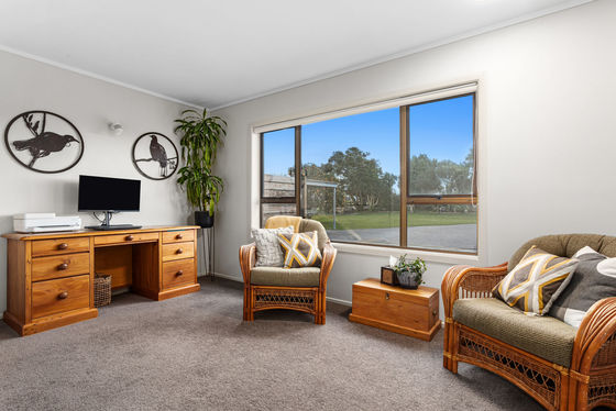 The residence includes five spacious bedrooms - the master suite with an ensuite and French doors that lead to the deck. Three additional bedrooms and a wet shower bathroom are situated in the southern wing, including a versatile bedroom ideal for an office, with direct access to the sunroom and front entrance.