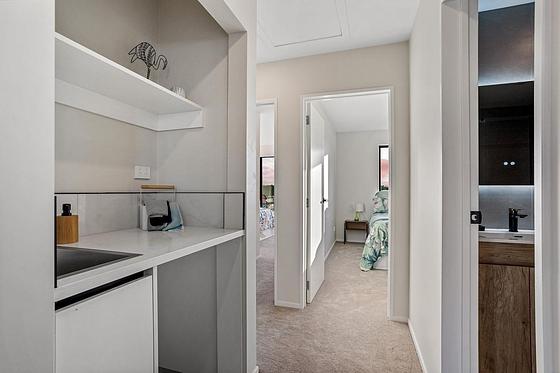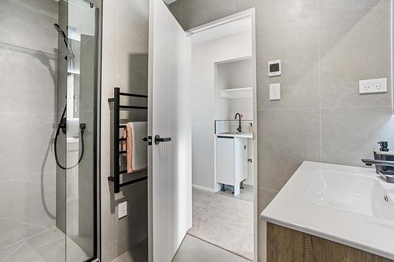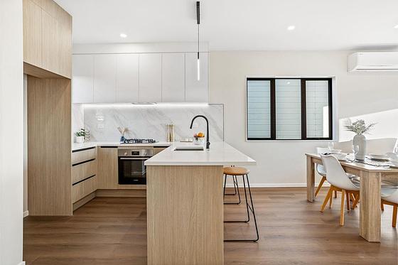 Downstairs offers a light-filled open-plan living and dining area alongside a sleek modern kitchen with breakfast bar and striking splashbacks. It is the kind of space you will be proud to host in, whether it is casual catch-ups or special occasions. Glass sliders then extend the living out to a sunny deck and fully fenced garden. A guest toilet and a carpeted garage with internal access add even more everyday convenience