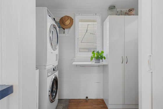 The layout includes three well-appointed bedrooms, a family bathroom with bath and shower, and a separate toilet. A practical laundry opens to rear storage and a rainwater tank, ideal for keeping the gardens flourishing during summer.