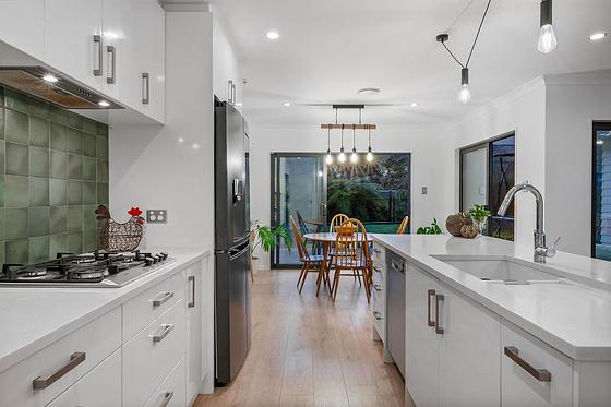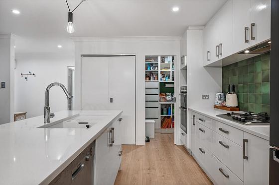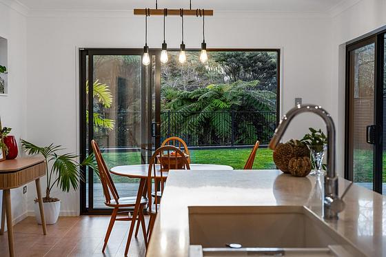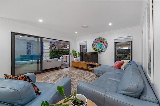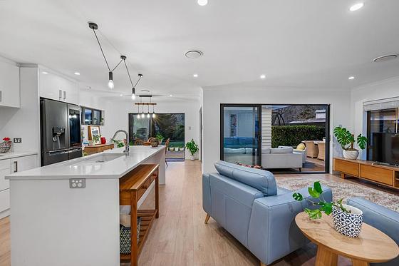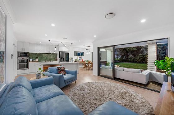 The main hub of the home is the open-plan kitchen, dining and living, designed for gathering, relaxing, and spilling out through big ranch sliders onto expansive decks and lawn with a green, forest backdrop. The kitchen is well set up with an island and walk-in pantry, and the whole space feels bright and practical. A second living room gives the option of a kids' zone, movie lounge, or quiet retreat, keeping the household happy and well spread out.