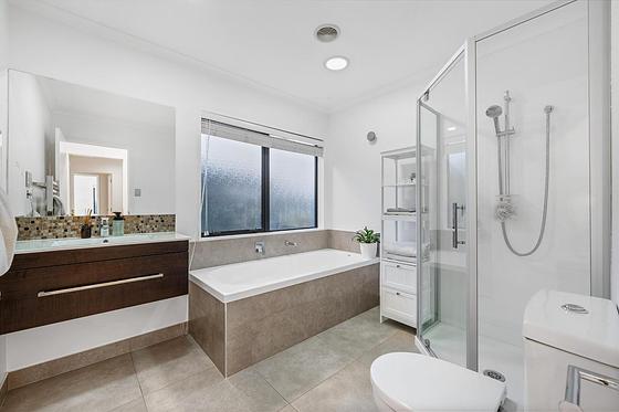 The master suite is its own haven with a walk-in robe, double vanity ensuite, and direct garden access. Four more double bedrooms provide plenty of space for family or guests, all with built-in storage. The family bathroom has both bath and shower, and there's the bonus of a separate guest toilet. An internal-access double garage with rear access and laundry space adds convenience, and the fully fenced backyard is private, green, and easy to enjoy.
