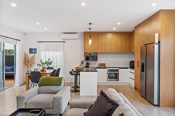 The open plan living space is bright and spacious, anchored by a sleek kitchen where wood and white finishes meet a bold black benchtop and breakfast bar. Cupboards rise to the ceiling, appliances are all modern, and the finer touches like a waste disposal unit show real thought in practicality and appeal. This is a home that works hard while still looking stylish.