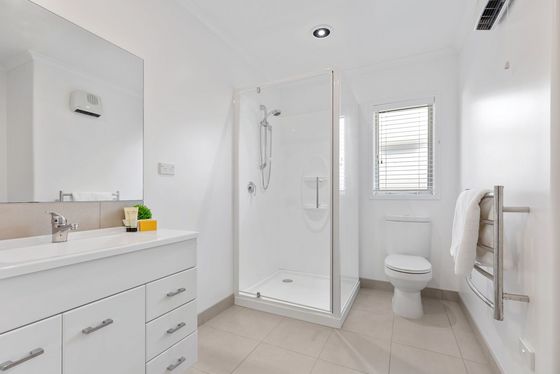The master bedroom is generous, light-filled, and impeccably styled, complete with a walk-in wardrobe, ensuite, a large tiled shower and a sliding door that opens to the garden.
