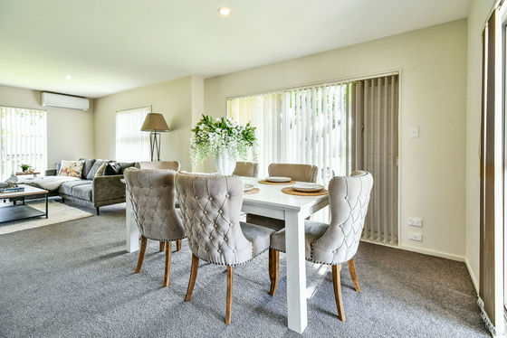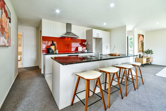 The home features four double sized-bedrooms, the master suite complete with walk-in wardrobe and ensuite. The modern style open-plan kitchen, dining, and lounge area is designed for easy family living and entertaining, with a heat pump for year-round comfort, plus seamless indoor-outdoor flow through a ranchslider to the fully fenced rear yard.