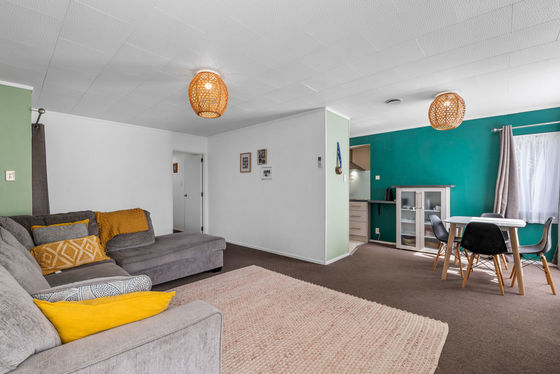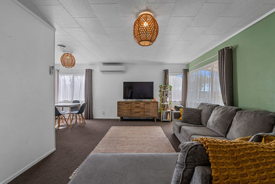 The living area is warm and inviting, complete with a heat pump to keep things cosy in winter and cool in summer. Big windows flood the room with natural light, while the soft green feature wall and modern lighting set the perfect atmosphere for relaxing evenings at home.