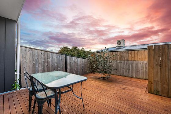 Step inside and the ground floor sets the tone with light-filled open-plan living, dining and a modern white kitchen. Large sliders connect you to the sunny rear deck with its feature tree, perfect for morning coffee or evening drinks. The front has an enclosed space with hedges and even a tidy spot for bins, keeping everything sharp and functional. A guest toilet plus a tucked-away laundry under the stairs add to the clever use of space.