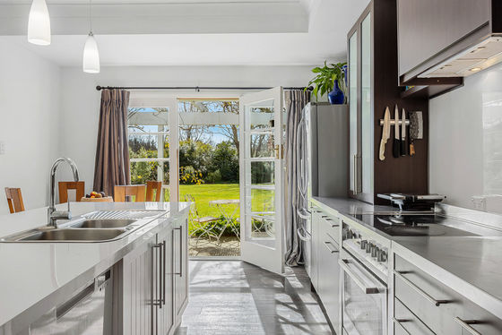 Originally built in the 1950s and relocated from Glandovey Road, Fendalton, in the 1980s, this inviting 290sqm villa has been tastefully renovated and extended. At its heart is a generous open-plan kitchen, dining, and living space - warmed by both a log burner and a heat pump. French doors open onto a wisteria-clad wraparound veranda, offering a sheltered outdoor entertaining space with sweeping garden views. A second lounge provides a quiet retreat, also opening onto the veranda.