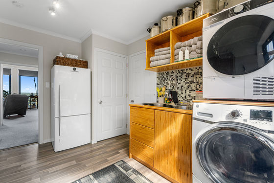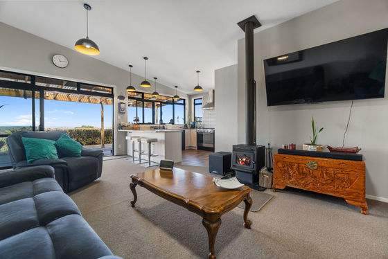 The heart of the home is its open-plan kitchen and dining area, flowing seamlessly into spacious living zones and out to a massive deck that captures breathtaking views. A wood burner ensures warmth and comfort during the winter months, while in summer, the outdoor spaces truly shine.