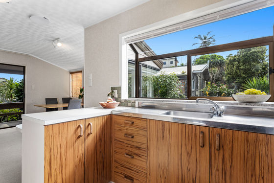 The kitchen and sunbed nook are gorgeous in the morning - a wonderful place to greet the day with your coffee. The open plan living is light and bright - and beautifully sunny also in the afternoon. A slider opens to the western deck and steps down to the garden. Private and sheltered, this green space is perfect to relax, play (pop up the volleyball net) or develop further outdoor entertaining areas. The quintessential Kiwiana Pohutukawa tree brings the beach bach vibe to life during the summer. String up the festoon lights and celebrate!