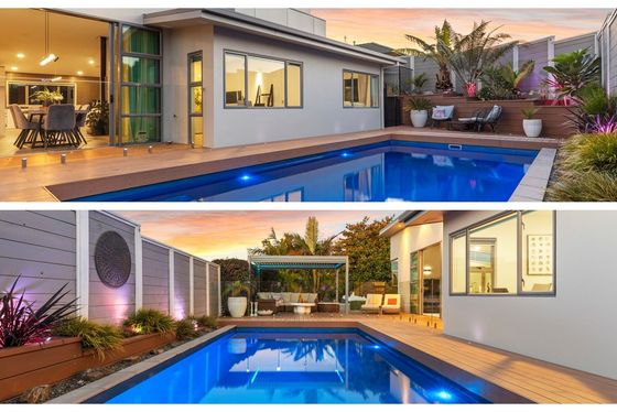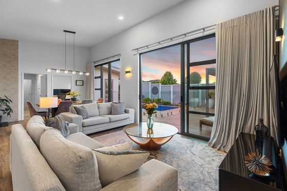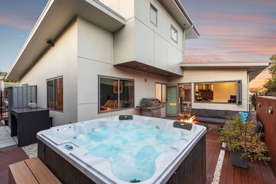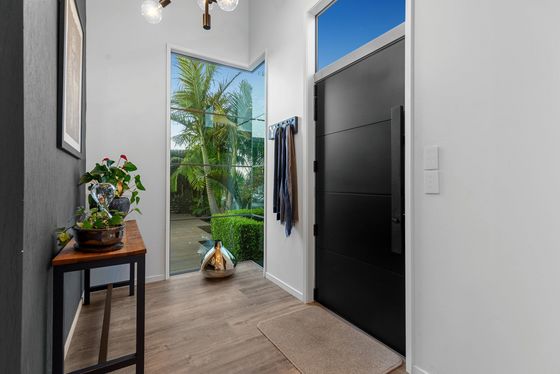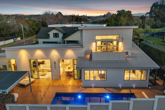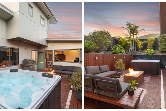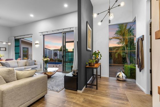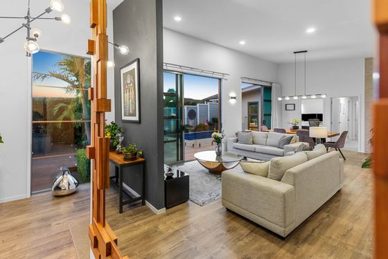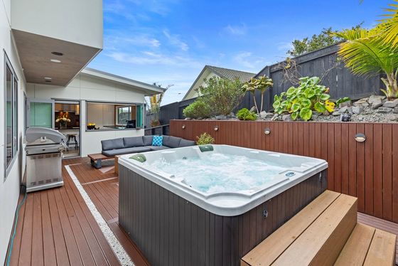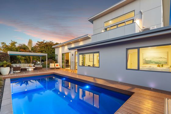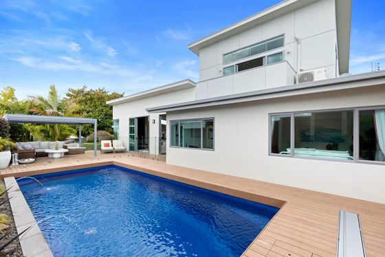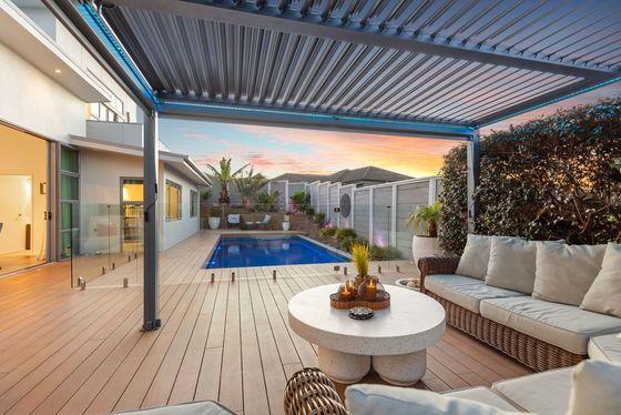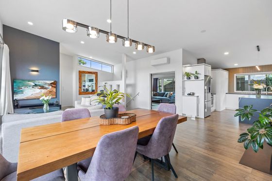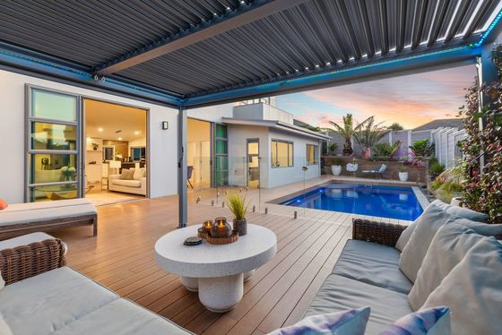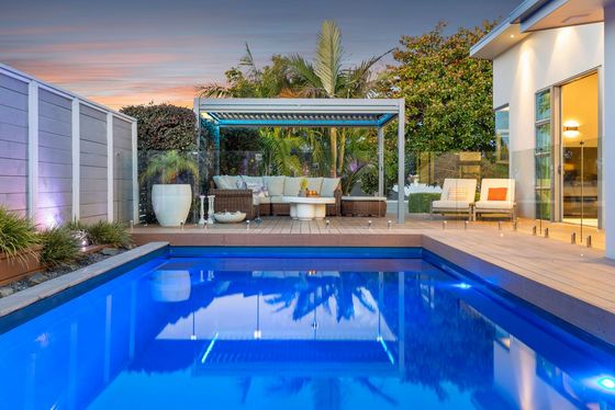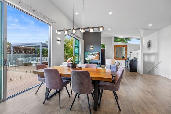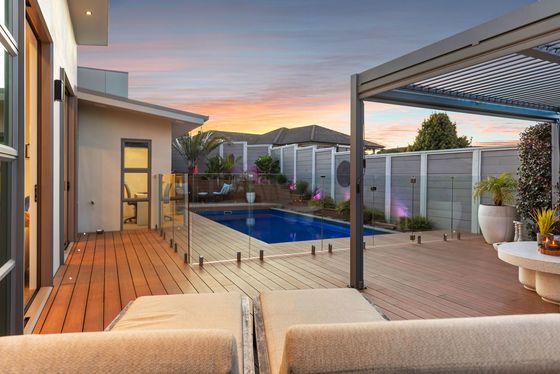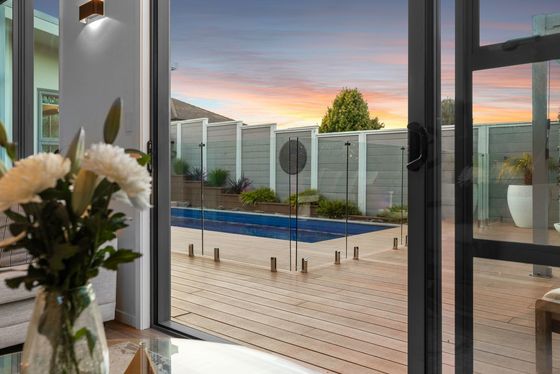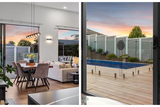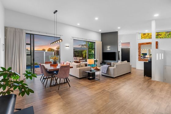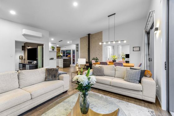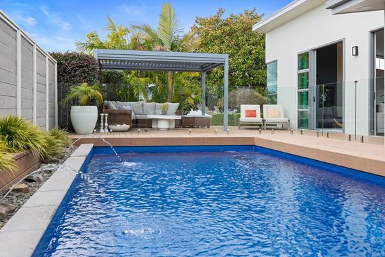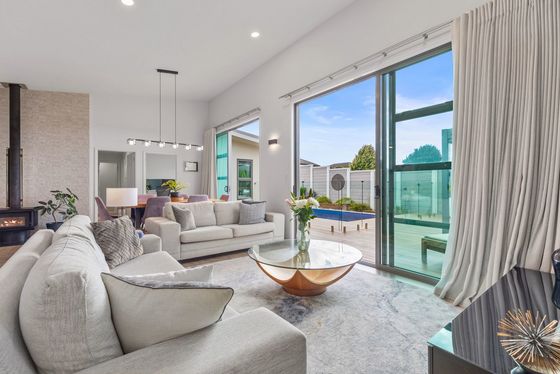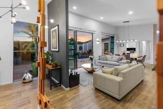 Inside you'll discover expansive, double-volume open-plan living warmed by a wood-burning fireplace. The modern kitchen, complete with gas hob and all the expected conveniences, connects effortlessly with the dining and lounge areas, before extending out to multiple outdoor entertaining zones. From the covered LouvreTec patio to the lush tropical garden and decking, every space has been carefully crafted with gatherings in mind. The showstopping centrepiece is the beautiful, heated salt-chlorinated swimming pool, enhanced by elegant lighting and soothing water features. Framed by a bespoke glass enclosure and complemented by a spa, it's the ultimate setting for year-round relaxation and entertaining. A separate lounge provides flexibility for family living, while two heat pumps and full insulation ensure a warm, comfortable environment in every season.
