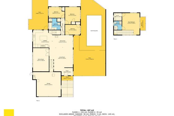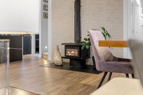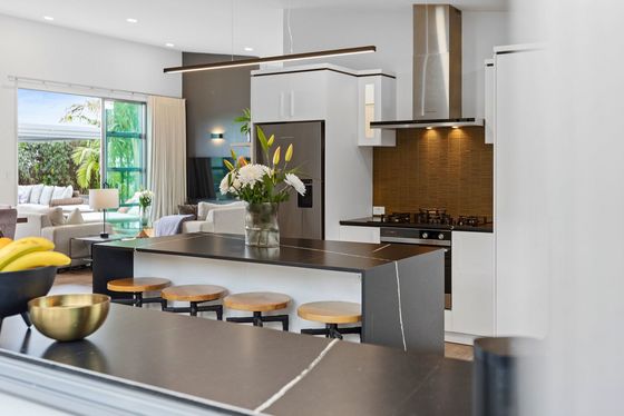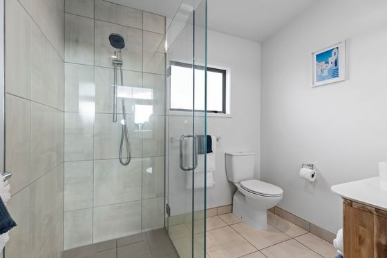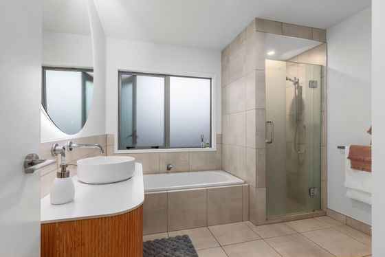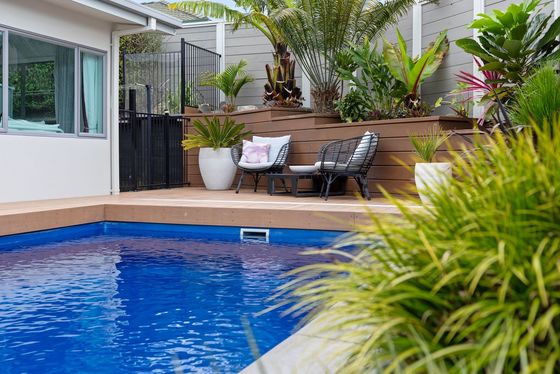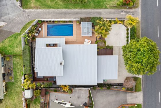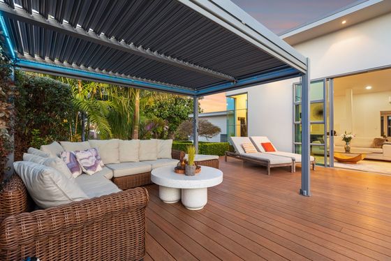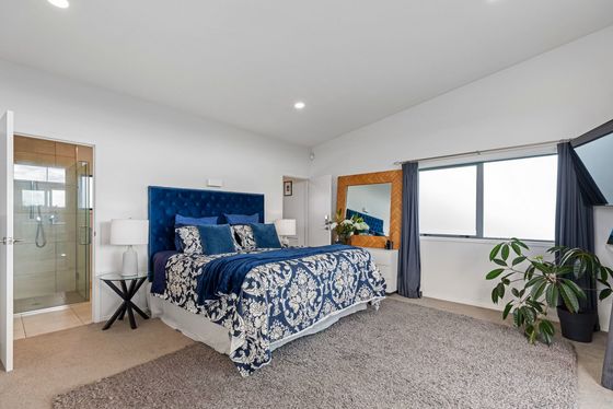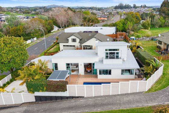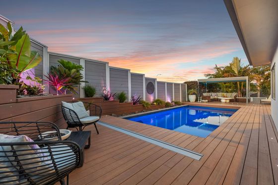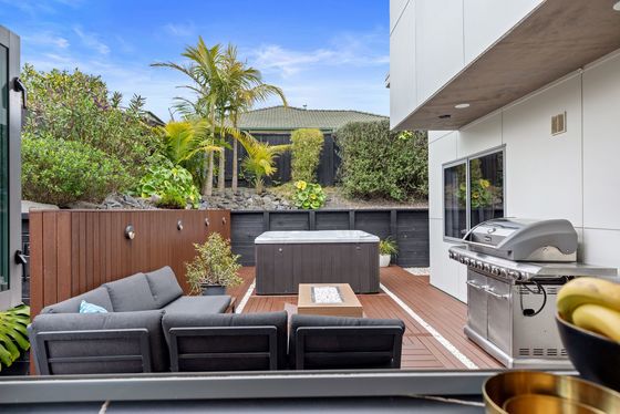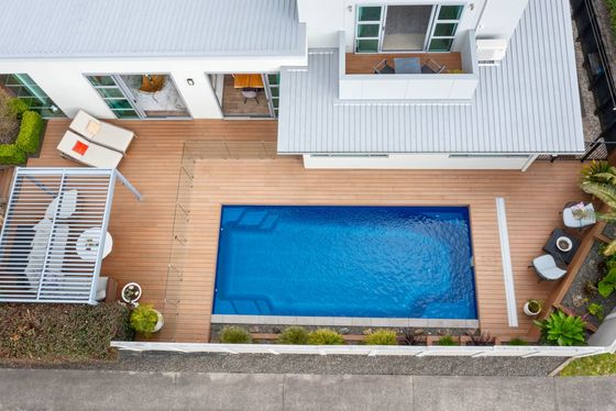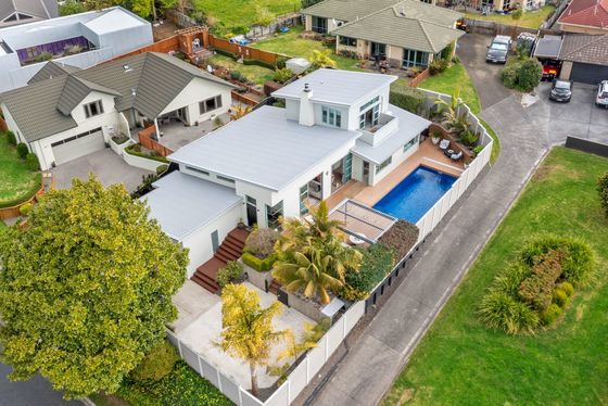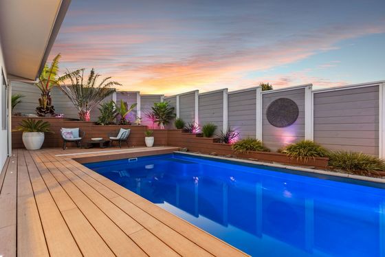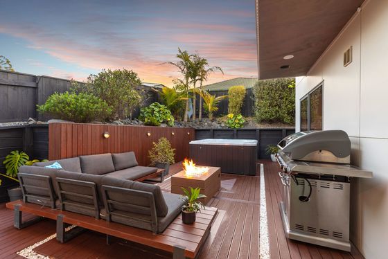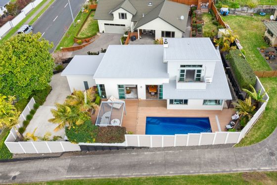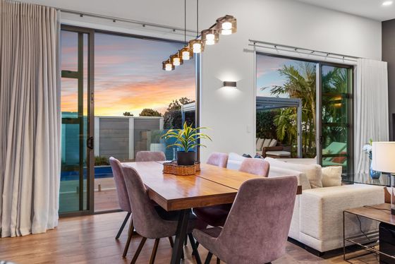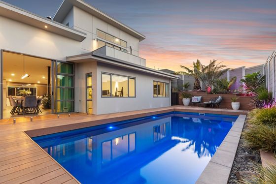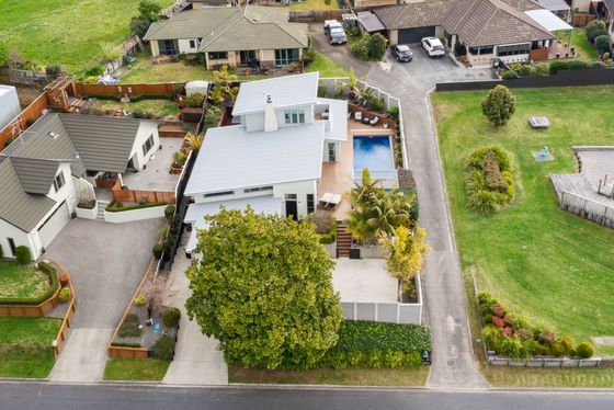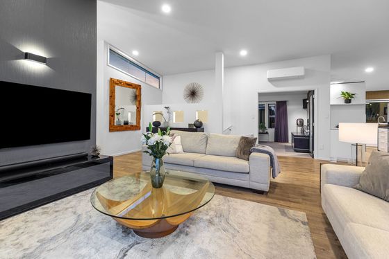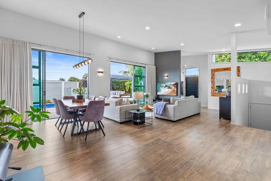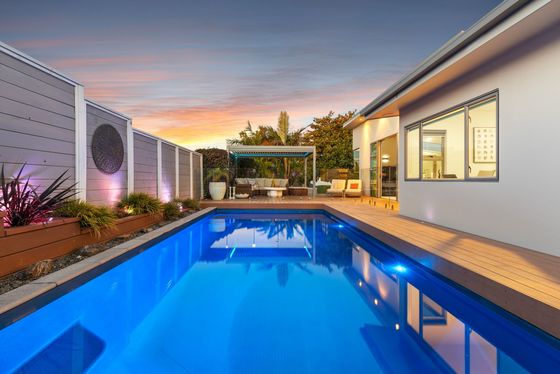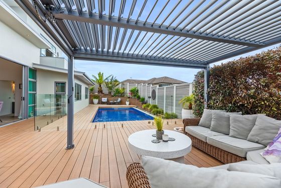 Inside you'll discover expansive, double-volume open-plan living warmed by a wood-burning fireplace. The modern kitchen, complete with gas hob and all the expected conveniences, connects effortlessly with the dining and lounge areas, before extending out to multiple outdoor entertaining zones. From the covered LouvreTec patio to the lush tropical garden and decking, every space has been carefully crafted with gatherings in mind. The showstopping centrepiece is the beautiful, heated salt-chlorinated swimming pool, enhanced by elegant lighting and soothing water features. Framed by a bespoke glass enclosure and complemented by a spa, it's the ultimate setting for year-round relaxation and entertaining. A separate lounge provides flexibility for family living, while two heat pumps and full insulation ensure a warm, comfortable environment in every season.