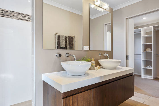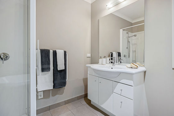 Accommodation is flexible and generous. The master suite is a true retreat, complete with a walk-in wardrobe and a luxurious ensuite featuring dual vanities and a tiled walk-in shower. Two further double bedrooms, a study or fourth bedroom, and a stylish family bathroom with bath offer options for families, guests, or work-from-home setups.