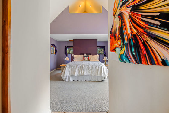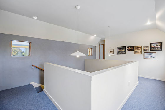 Upstairs, the home is cleverly divided into two wings joined by a gallery overlooking the entrance foyer. Solar warmth from the sun gallery below rises through feature windows, helping heat the upper floor naturally. To the east, two spacious bedrooms and a bathroom provide ideal family or guest accommodation. To the west, two more bedrooms also enjoy attic-style ceilings and lush garden views. A large storeroom offers the opportunity to add a third bathroom if desired.