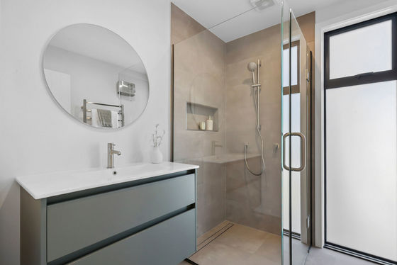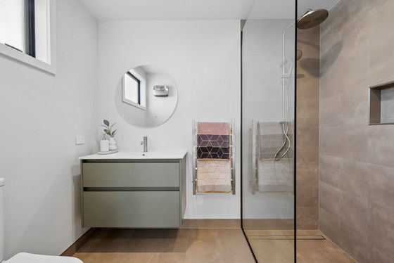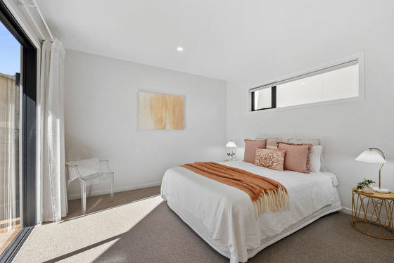 Inside, over 180sqm of light-filled interiors showcase soaring ceilings, expansive living and dining, and a designer kitchen complete with stone benchtops, induction cooking, and premium appliances. The master suite is a private retreat with a walk-through wardrobe, heated tiled ensuite, and seamless flow to a north-facing deck.