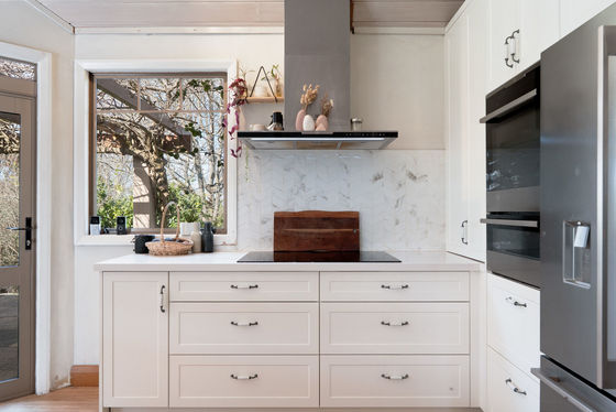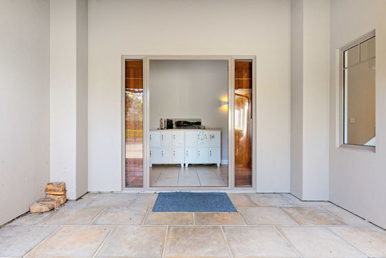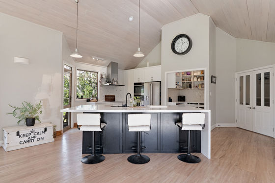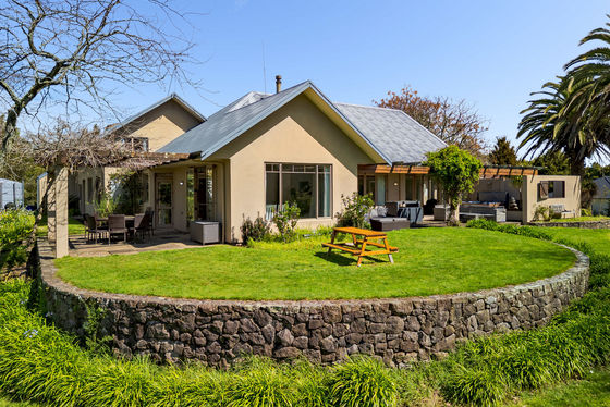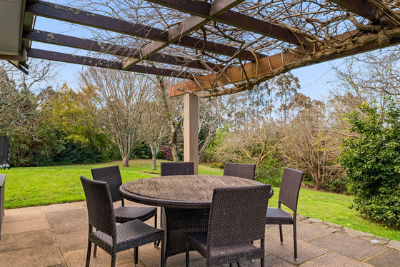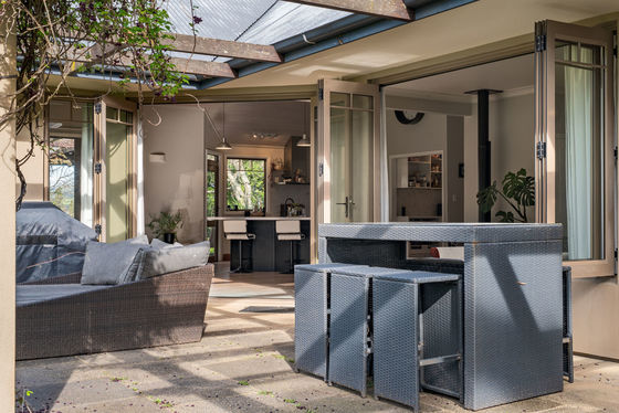 The five-bedroom house evokes a comfortable, relaxed ambiance across its 370 sqm (approx.) layout. The spacious reception foyer flows into ground-floor living areas comprising a series of entertainment zones, each capturing picturesque green vistas and connecting to the pergola-covered alfresco terrace. A calm neutral palette, complemented by light-toned timber laminate flooring, creates a modern vibe with the décor ready for redecoration if desired. Voluminous raking ceilings soar above an open plan family dining area with log burner, while the adjacent country-style kitchen includes a walk-in pantry and stone-topped island bench. A formal sitting room with café-style bifold windows leads onto another separate lounge flanking the walled plaza, a perfect zone to add a spa which is also accessed from the master suite.