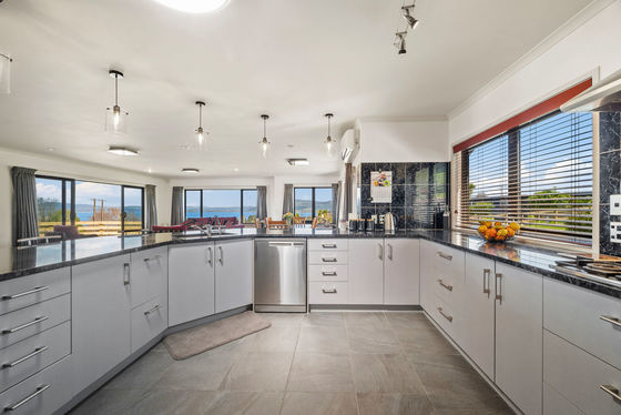 At the heart of the home is a spacious open-plan living area, complemented by a modern, well-appointed kitchen with a six-stool breakfast bar-all capturing the lake views. Sliding doors open seamlessly to an expansive lakeside deck, perfect for entertaining or simply relaxing. The master suite is privately positioned at one end of the home, complete with ensuite and walk-in wardrobe. Three further double bedrooms, each with deck access and lake views, provide plenty of space for family or guests. While also offering a well-positioned Arch Gola for those entertaining moments.