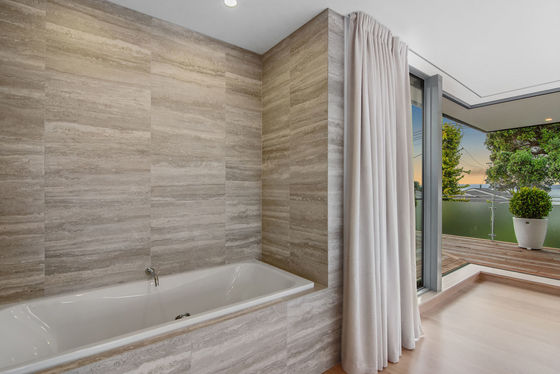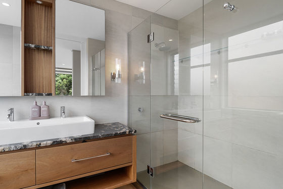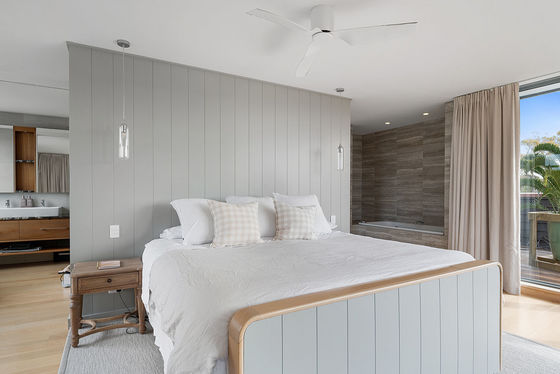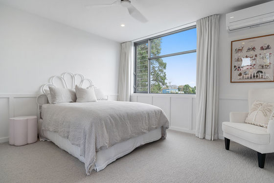 As you ascend upstairs, you are greeted by a spacious master suite complete with an ensuite, custom wardrobes, and a dressing area. One of the standout features of this suite is the frameless corner stacking sliders that seamlessly open to a large north-facing sundeck. This outdoor space offers breathtaking views that stretch across to the pristine Manly Beach. In addition to the master suite, the upper level boasts four generously sized bedrooms, each equipped with ample storage and natural light, as well as a beautifully appointed family bathroom.