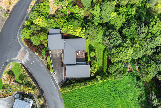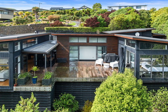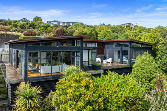 Nestled high on Kennedy's Bush Road, you're invited to discover, among the trees and bush, a completely private property. Set on a gently sloping 1386sqm, the house - built in 2015 - while elevated, is set across a single level with a mono-pitch roofline creating high ceilings and seemingly acres of glass. Three of the 'pavilions' are formed in a U shape around huge central decking, facing north-west, it is sun-drenched and sheltered. Vast sliding doors on three sides open to this 'interior courtyard' allowing indoor outdoor ebb and flow almost year-round.