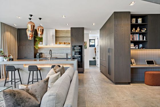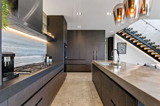 Entering the home, an impressive double-height entry and open staircase lead to a beautifully designed kitchen with Miele and Liebherr appliances, bespoke cabinetry and an open-plan living area, which is the heart of the home. Heated natural stone floors run throughout the living spaces. Entertaining is effortless, with seamless indoor-outdoor flow to outdoor living spaces and a 9-metre heated saltwater pool.