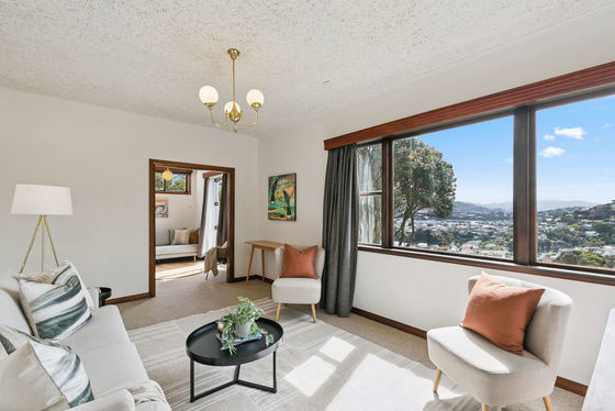 - North-facing living room with stunning views over Strathmore and Miramar, stretching toward