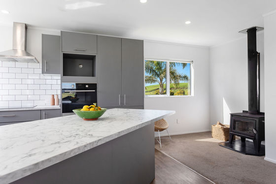 The open-plan living area overlooks the stunning scenery and seamlessly flows onto a large north-facing deck, ideal for entertaining guests or relaxing while enjoying the spectacular elevated views. Comfort is ensured with an efficient wood burner, while solar adds to the property's energy efficiency, reducing utility costs.