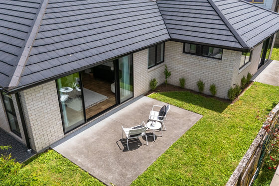 The tidy brick-clad exterior with linear detailing and tile roof complements the easy-care freehold section. A sunny patio and landscaped gardens provide a simple, enjoyable outdoor space, with fencing that could easily be completed for full enclosure.