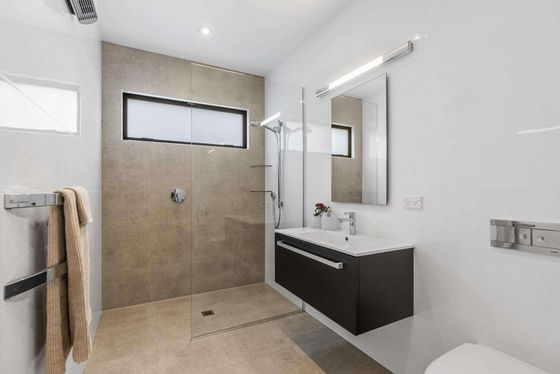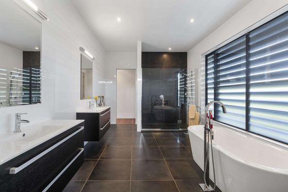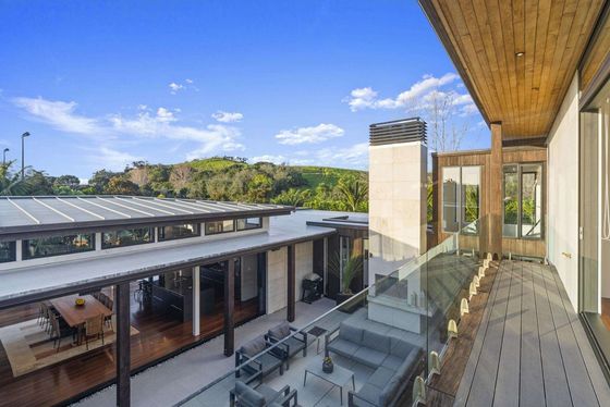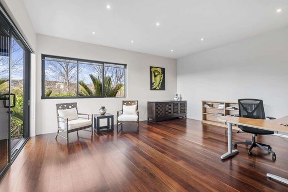 Upstairs, the main suite forms its own private zone, complete with a walk-in wardrobe, ensuite, an additional bedroom or nursery, and a generous study or second lounge. Balconies on this level enjoy elevated outlooks across the surrounding landscape.