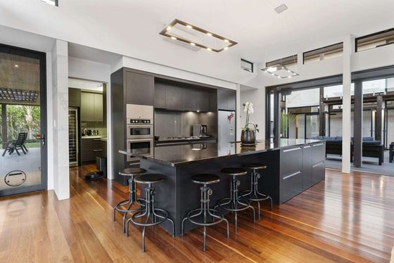 At the centre of the home is an open-plan kitchen, dining and living space designed for gathering. The kitchen is particularly well suited to entertaining, supported by a butler's pantry and easy flow to outdoor areas on both sides. Retractable sliders and airflow windows open to a sheltered internal courtyard, a space that comes into its own in the evenings, ideal for quiet drinks by the fire, family dinners and celebrations.
