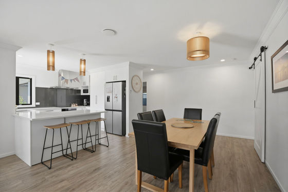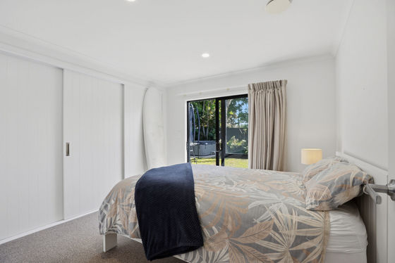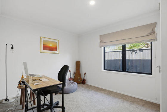 At the heart of the home, the open-plan kitchen, dining, and living area has been carefully considered to encourage connection and entertaining. The kitchen is both stylish and functional, featuring engineered stone benchtops, abundant storage, and a charming servery window, the perfect spot to enjoy a quiet morning coffee.