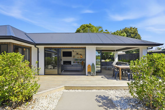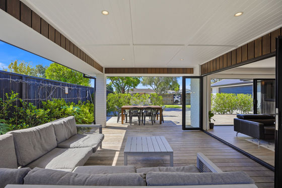 Large sliding doors seamlessly extend the living space onto beautiful hardwood timber decking, where a covered outdoor entertaining area creates a welcoming setting for year-round gatherings.