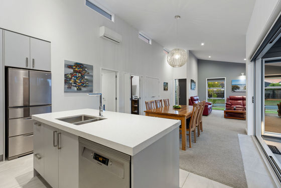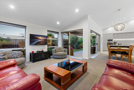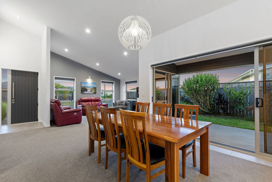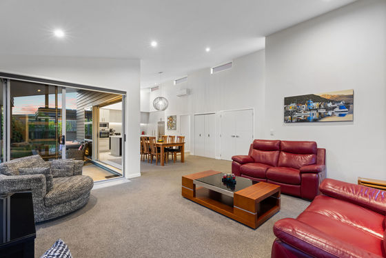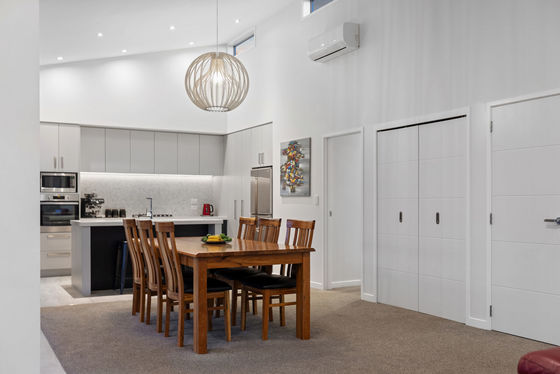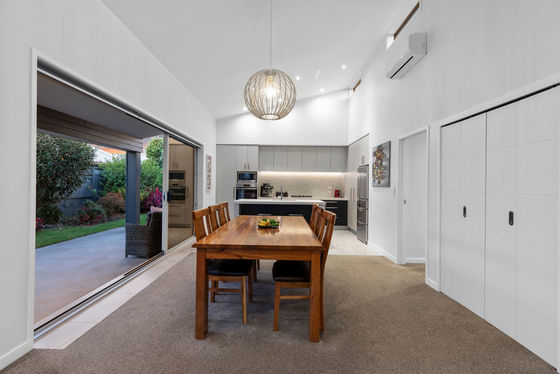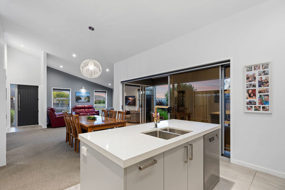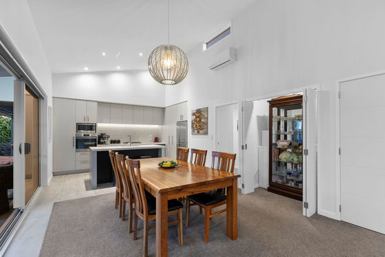 Light-filled open-plan living is elevated by a striking vaulted ceiling, creating a sense of volume and architectural elegance. The lounge, dining, and kitchen are seamlessly connected, each appointed with double blinds, creating an elegant setting for both relaxed daily living and stylish entertaining.