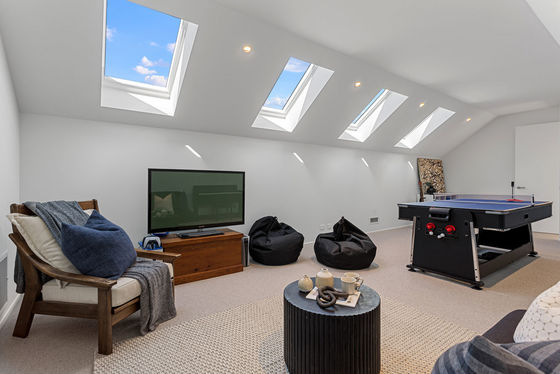 Above, a loft-style living space with skylights and ducted heating offers versatility as a teenagers' retreat, guest space or future conversion, with plumbing already in place.